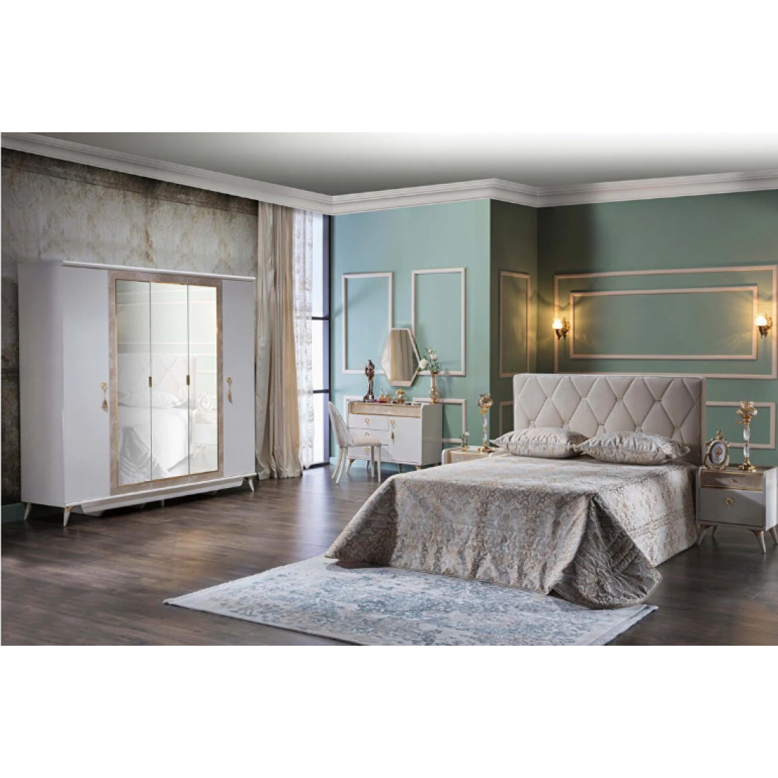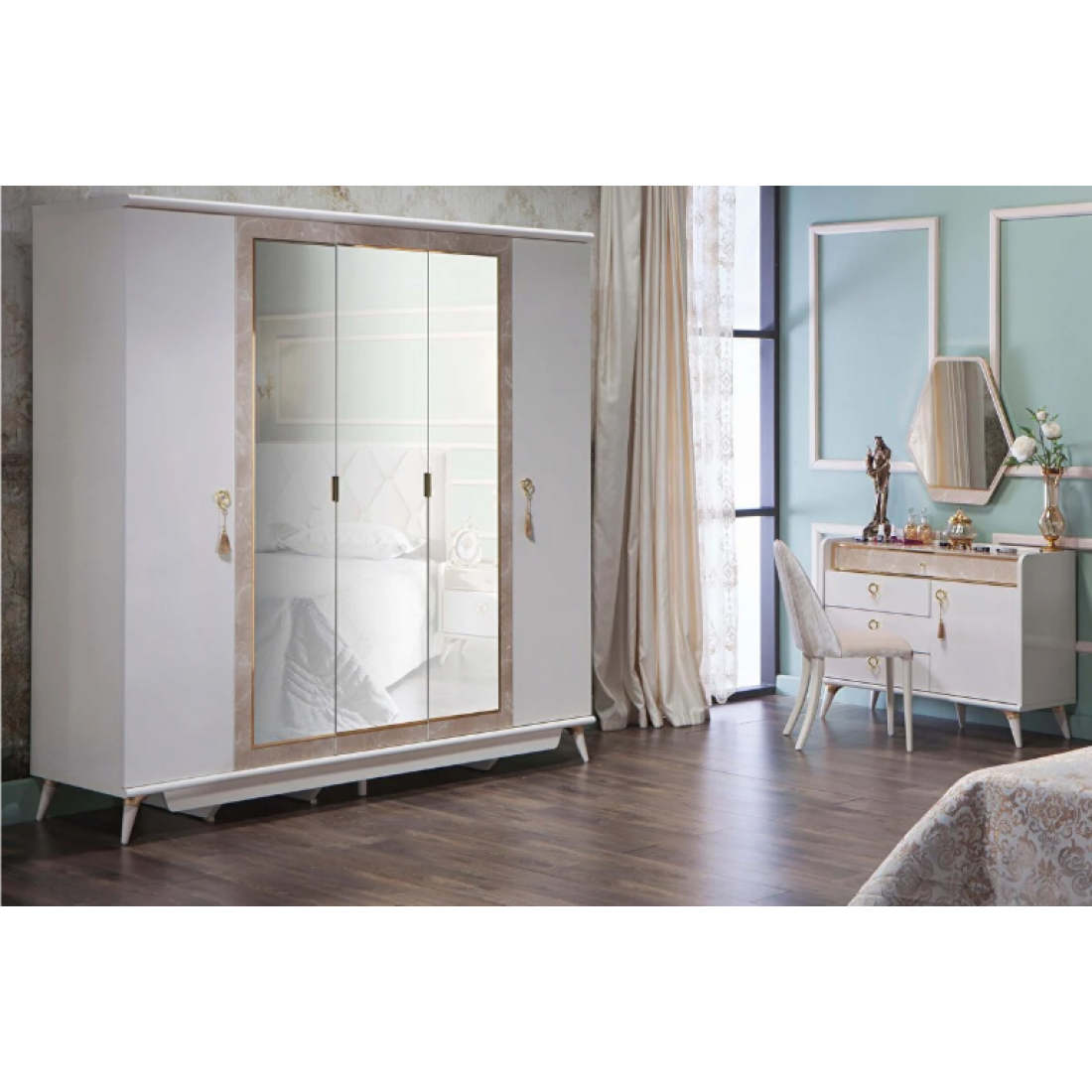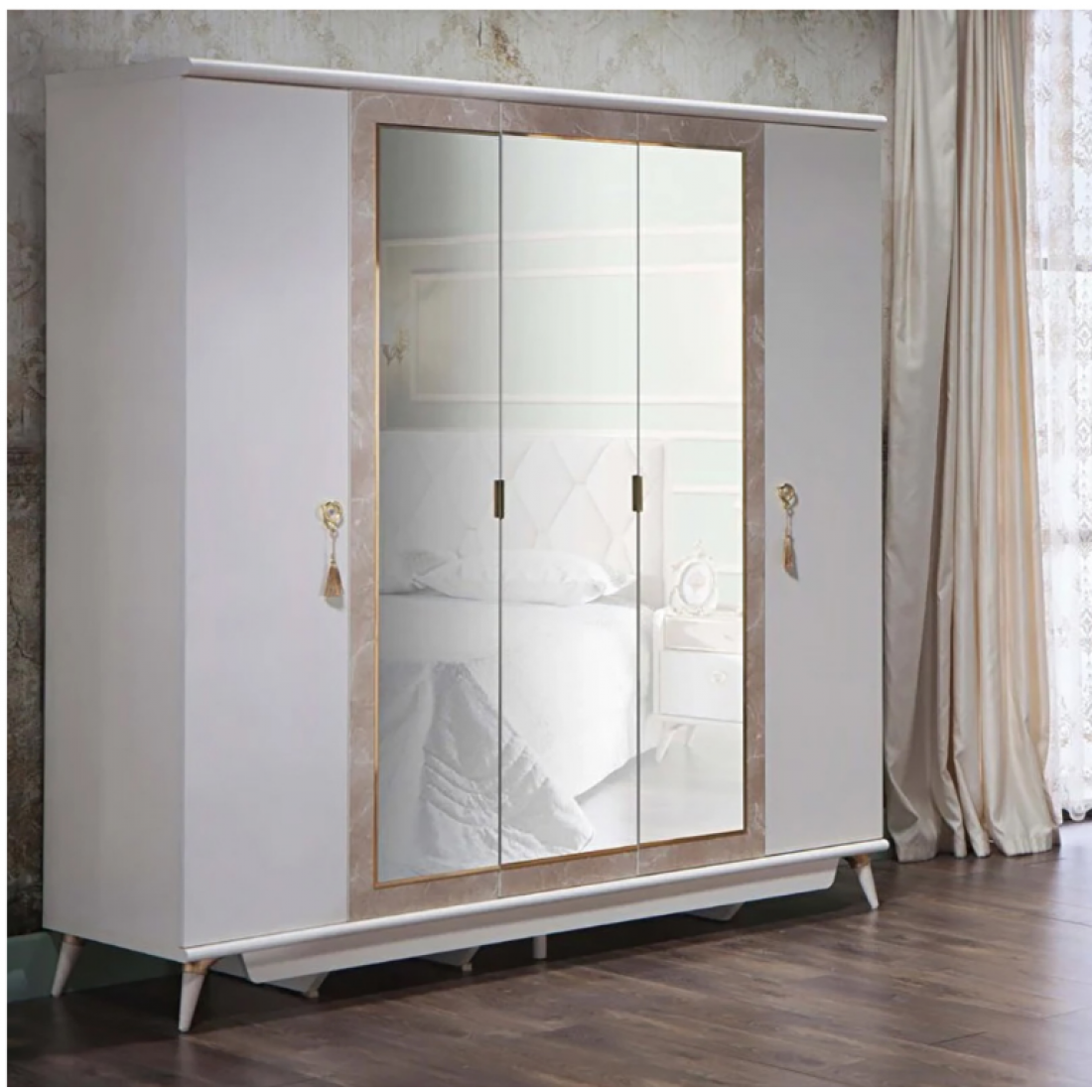 Пятидверный платяной шкаф Monreal от Bellona. Три зеркальные двери с отделкой под мрамор по центру, металлическими ручками в виде петли. Шкаф вместительный, по высоте подходит для большинства помещений, глубина 61 см - позволит удобно разместить вешалки с одеждой. Наполнение шкафа – одно широкое отделение с вешалкой, полкой и ящиками, три узких отделения с полками и штангами. Двери с доводчиками, обеспечивающими плавный ход и безопасность. Шкаф изготовлен из высококачественного ЛДСП производства Турция, класс эмиссии формальдегидов Е1. Серия снята с производства