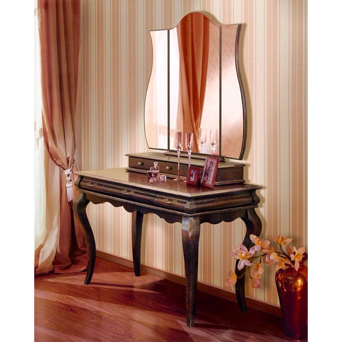 Туалетный столик с тройным зеркалом продолжает модельный ряд коллекции мебели для спальни "Оскар". Столик декорирован гнутыми ножками и резьбой. Выдвижные ящики на направляющих. Фасад сделан из массива дуба, окрашен в оттенок "Орех".