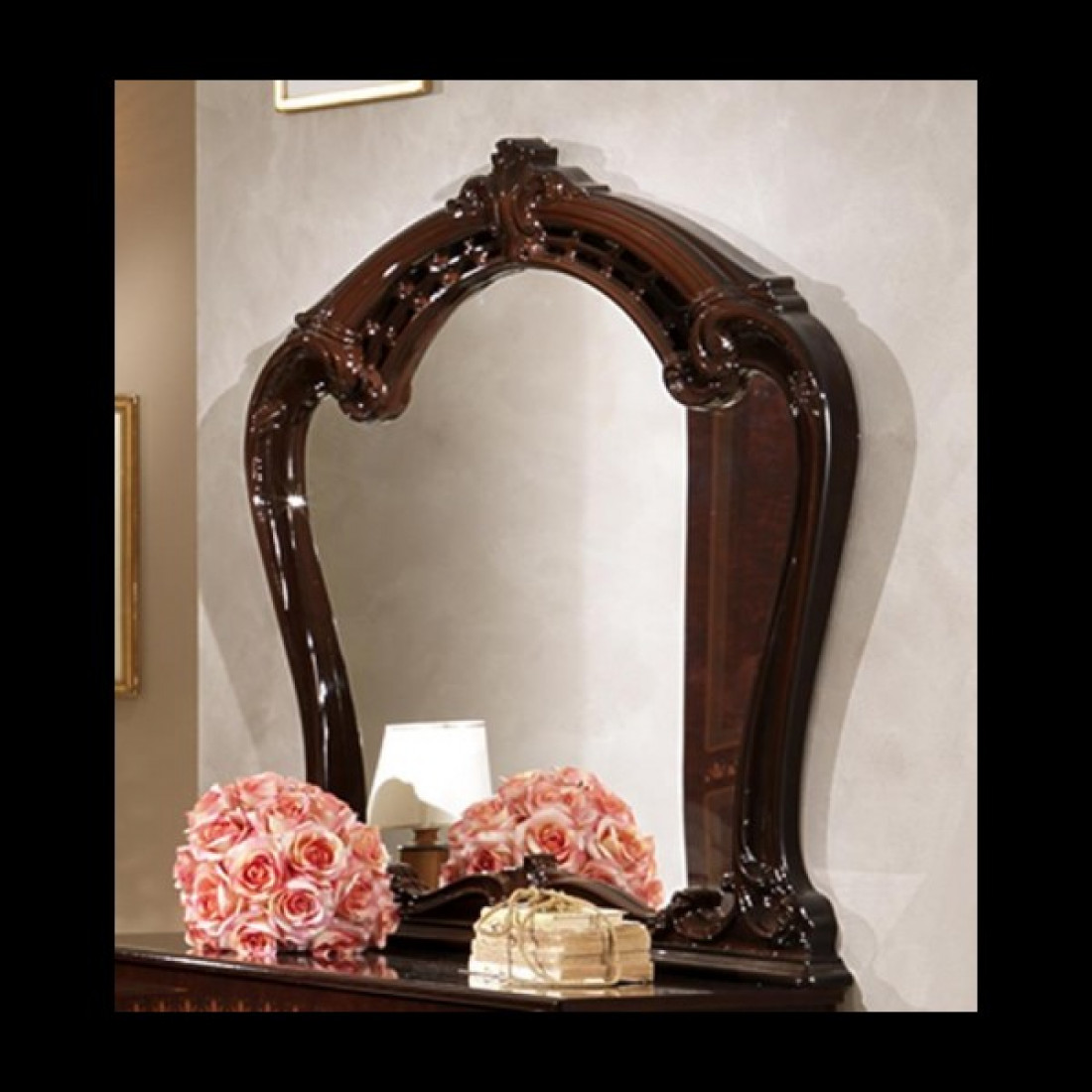 Зеркало для туалетного столика Роза (могано) от Российской фабрики «ДИА мебель», выполнено в элегантном цвете могано. Зеркало имеет красивую и нестандартную форму и будет отличным дополнением к туалетному столику любой ширины.